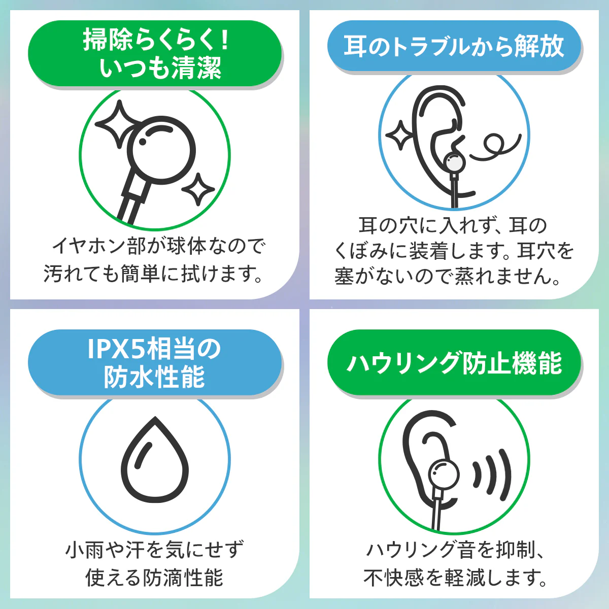 イヤホン部は、穴も凹凸もない球体のため、簡単に拭くことができ、常に清潔に保つことができます。